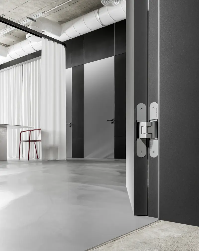 The extensive range of ANSELMI hinges offers premium products for lightweight residential doors. The concealed hinge system is suitable for both interior residential doors and interior doors weighing up to 60 kg and is available in several model variants. The hinge system can be adjusted in three dimensions and guarantees long-lasting, maintenance-free operation of the door and is available in a wide range of aesthetic designs.