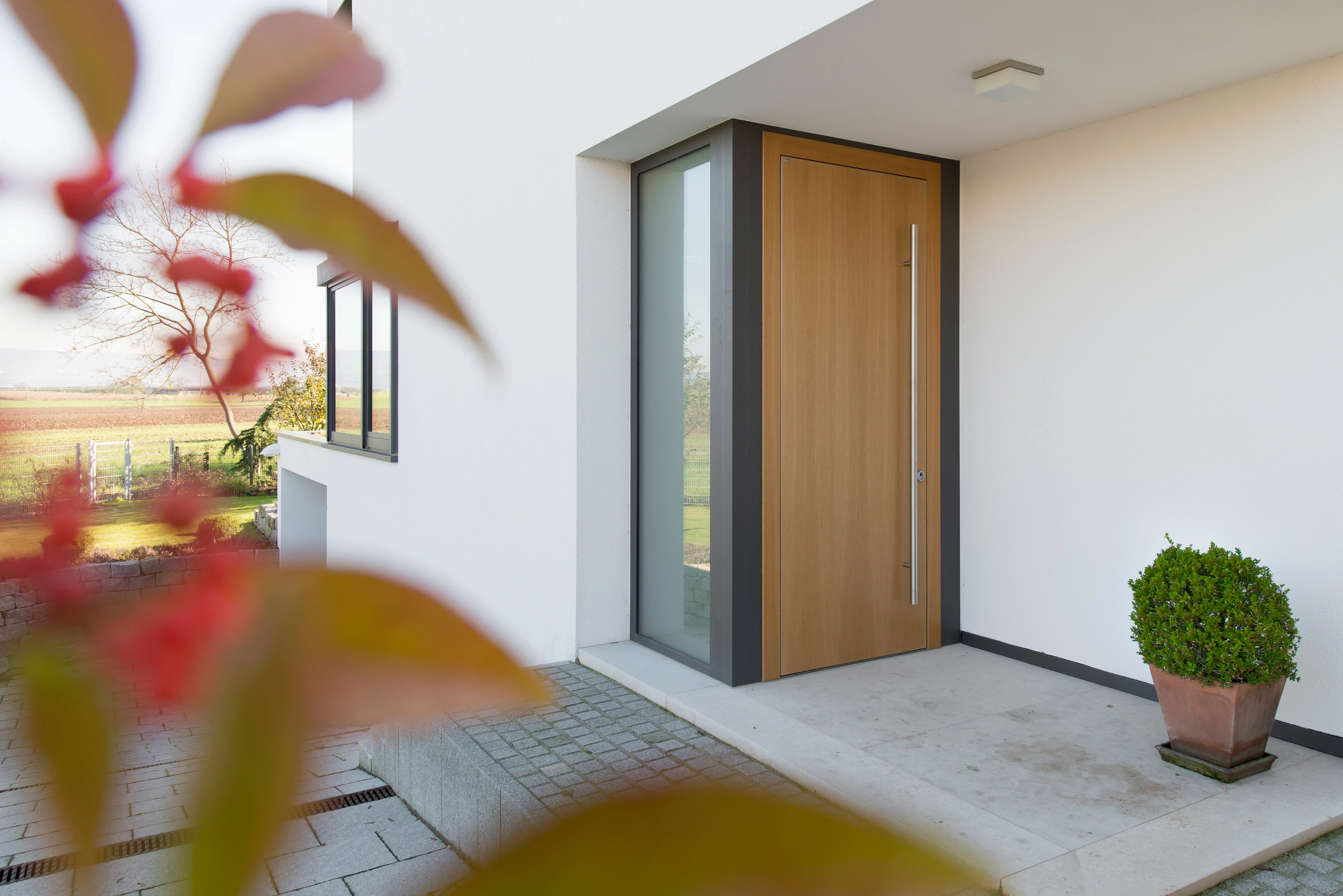 Timber is the most traditional material for entrance doors and is currently enjoying a big comeback. It combines natural aesthetics and tactile warmth with sustainable and ecological benefits. As a renewable resource, timber stores CO₂, requires significantly less energy to manufacture than aluminium or PVCu, and offers exceptional thermal and soundproof qualities. Premium timber entrance doors achieve market-leading U-values and, with minimal maintenance, can last for decades.